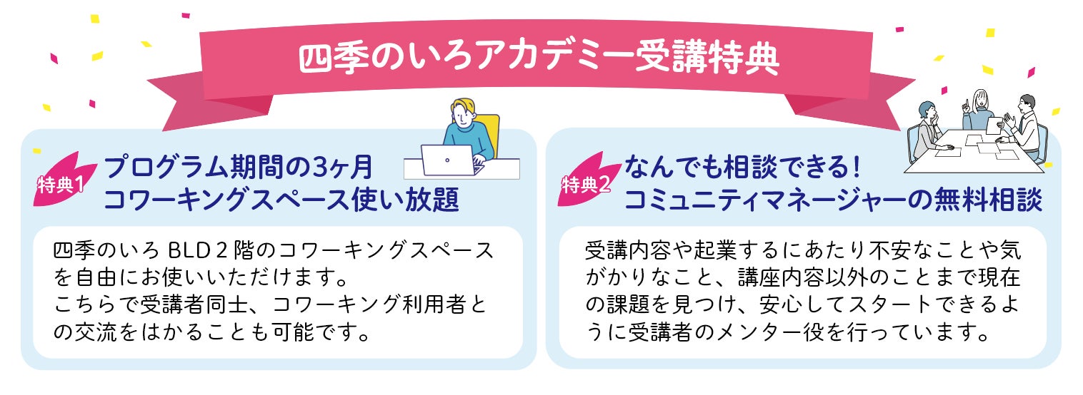 福岡を中心としたコミュニティサロン「四季のいろ 」(株式会社ラグジュアリー 代表取締役:春野英理、本社:福岡市博多区千代4-4-11 以下:同社)は新たな創業支援の一環として「四季のいろアカデミー」(以下:本プログラム)を2023年1月13日より開始する。
