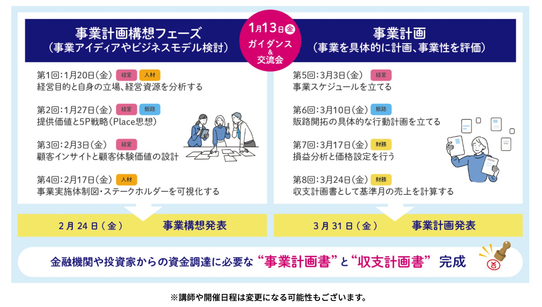 90日の創業を目指し、大きく起業に対する4つの柱(経営・人材・財務・販路)で構成された実践的プログラムとなっている。それらに加えて事業計画書と収支計画書の作成を目指し、実際の資金調達を視野に入れたピッチ・ビジネスコンテスト等を行い、若年層・子育て世代を中心とした「アイディアをカタチに」をコンセプトに創業支援を行う予定としている。