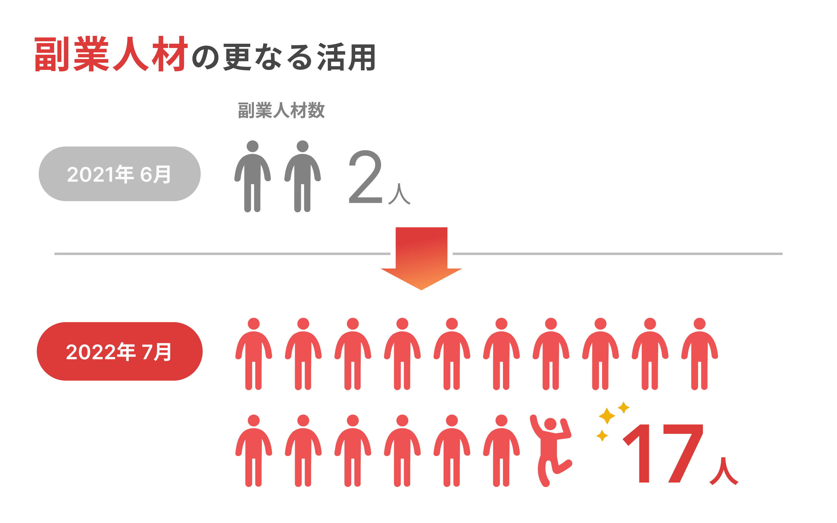 今後の事業拡大に伴い、更なる人材の確保は必須であり、これら副業人材に限らずあらゆる人材の採用を進めていく予定です。