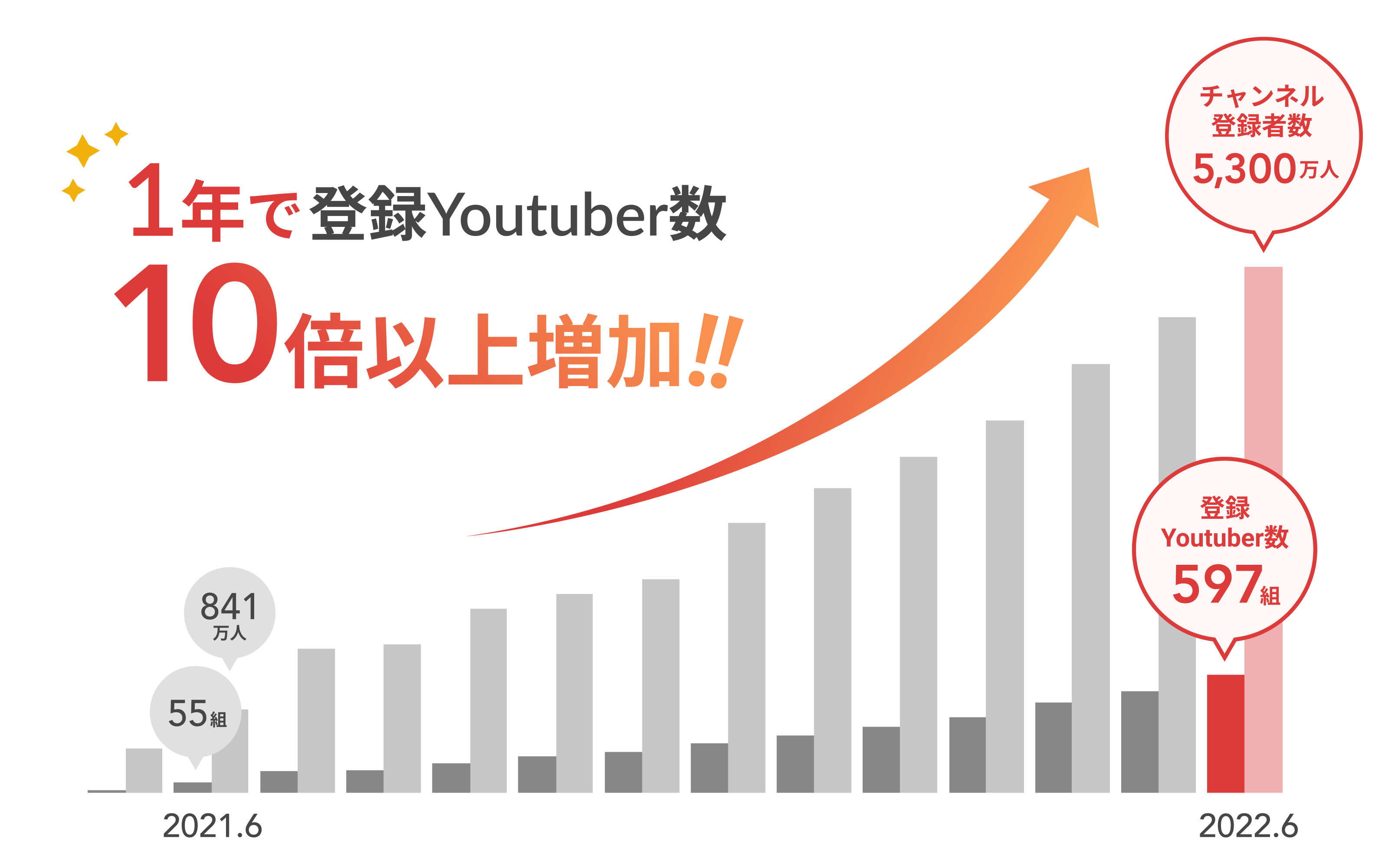 サービス開始後約1年で、登録YouTuber数は10倍以上増加。現在は600組を超え、YouTuberの合計チャンネル登録者数は5,450万人を上回っています。