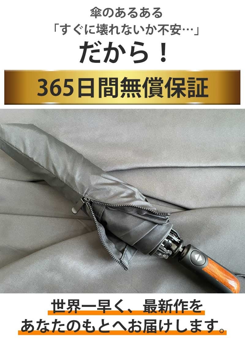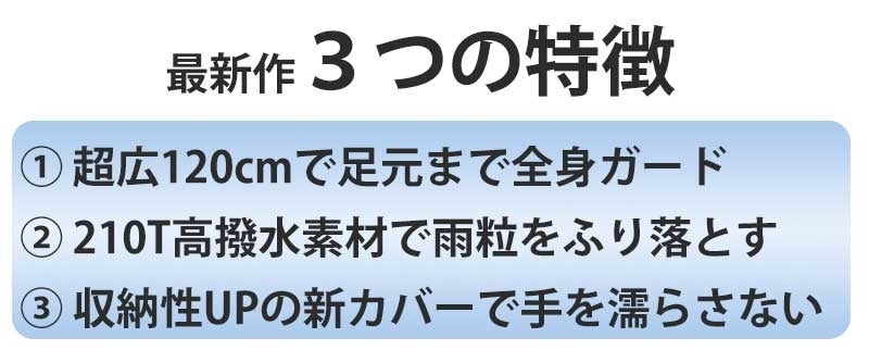 さらに、最新作では「もっと大きいサイズがほしい!」と、ユーザー様からのご要望が多かった点を改良。折りたたみ傘にして"120cmの超広サイズ"。横風でも濡れず、足元まで濡らさない仕様となりました。