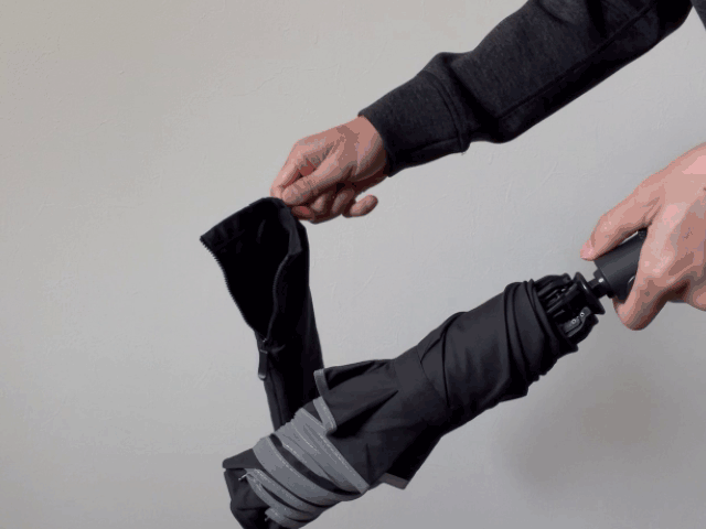 濡れた傘でまわりに迷惑をかけてしまったことはありませんか?電車、バス、車での移動や会社のフロアなど。自分は濡れなくても、濡れたがどこかに触れて濡らしてしまう。そんなことにならないように、内側に折りたたむことで雨粒を外側へ飛び散らないようにしました。