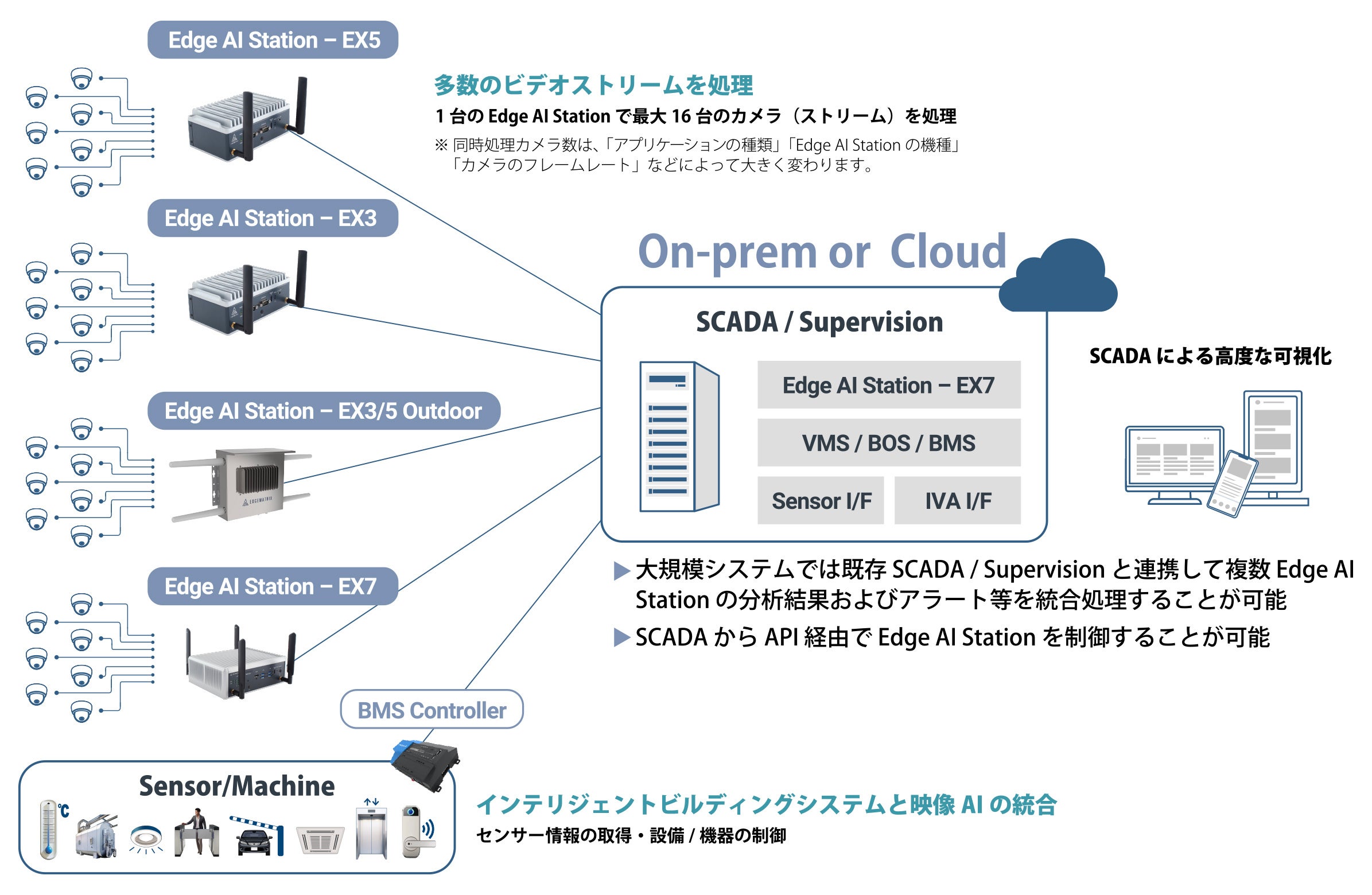 Edge AI Box EXシリーズに、多数のカメラとEdge AI Box、複数アプリケーションを遠隔運用管理するStaionOSを搭載するアプライアンス製品。外部ネットワークへの接続なしで単独動作が可能で、オンプレミスでの構成により通信コストの削減とプライバシー保護を実現します。