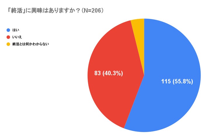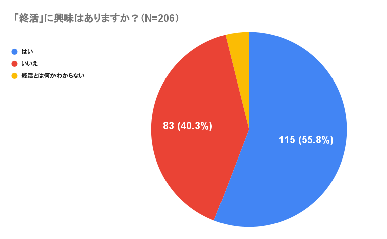回答者の半数を超える115名が終活に興味があると回答していました。終活に対してポジティブな印象を持っていても興味がないと答えている方も中にはいらっしゃるようです。また終活とは何かわからない方は8名で全体の約4%に過ぎず、回答者はほぼ「終活」という単語を認知しているという結果となりました。