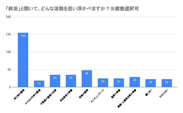 「終活」と聞いて思い浮かべる活動は「持ち物の整理」という選択が155件と圧倒的に最多で、一番最初に思い浮かべるのは持ち物の整理のようです。ただし、それ以外の活動についても平均して30件程度は選択されていました。財産から葬儀まで人によって終活の活動として思い浮かべるものはさまざまなようでした。「わからない」と回答した方はわずか24件でした。