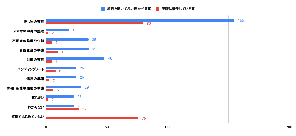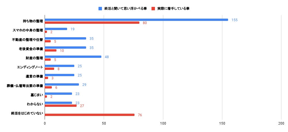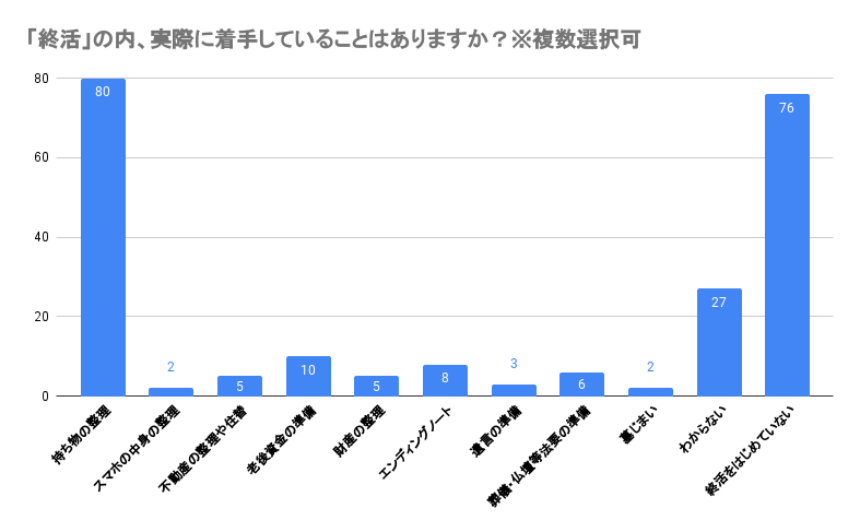 実際に着手している終活として「持ち物の整理」に80件の選択が集まっています。次に多い選択肢が「終活を始めていない」です。また、その他の活動についてはほとんど着手できていない様子がうかがえます。