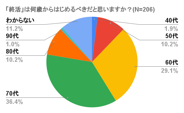 - 終活を始めるのは70代以降と回答した方がおよそ半数であった