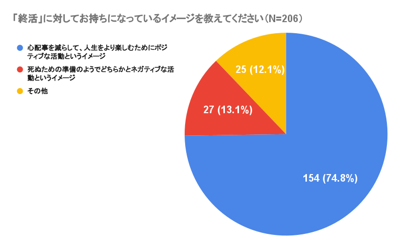 終活は「自分の死に備えた準備行動」なので、死を意識してしまい「ネガティブ」なイメージが先行すると予想していましたが、調査の結果、回答者の約75%に相当する154名が、終活は「心配事を減らして、人生をより楽しむためにポジティブな活動というイメージ」を持っていました。