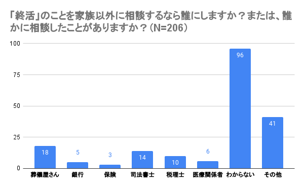 終活の相談相手に関する設問に対しては、「わからない」という回答者が約半数で圧倒的に最多でした。