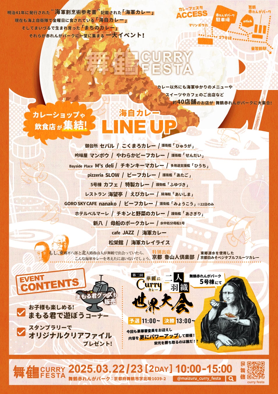 明治41年に発行された 『海軍割烹術参考書』に掲載されている「海軍カレー」から、現在も海上自衛隊で金曜日に食されている海自カレー、さらに舞鶴で生まれ育った「まちのカレー」、さらには近隣地域や京阪地区からもスパイスカレーやエスニックカレー その他様々なジャンルの飲食店が出店します。