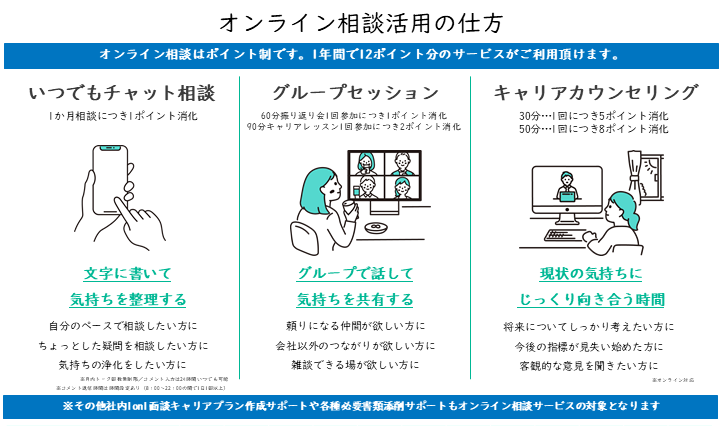 | オンライン相談 | ≪オンライン相談ポイント消化で対応≫ ・1か月いつでもチャット相談→1P消化 ・毎月7日オンライン振り返り会→1回参加につき1P消化 ・毎月21日キャリアレッスン→1回参加につき2P 消化 ・キャリアカウンセリング30分→1回につき5P消化 |