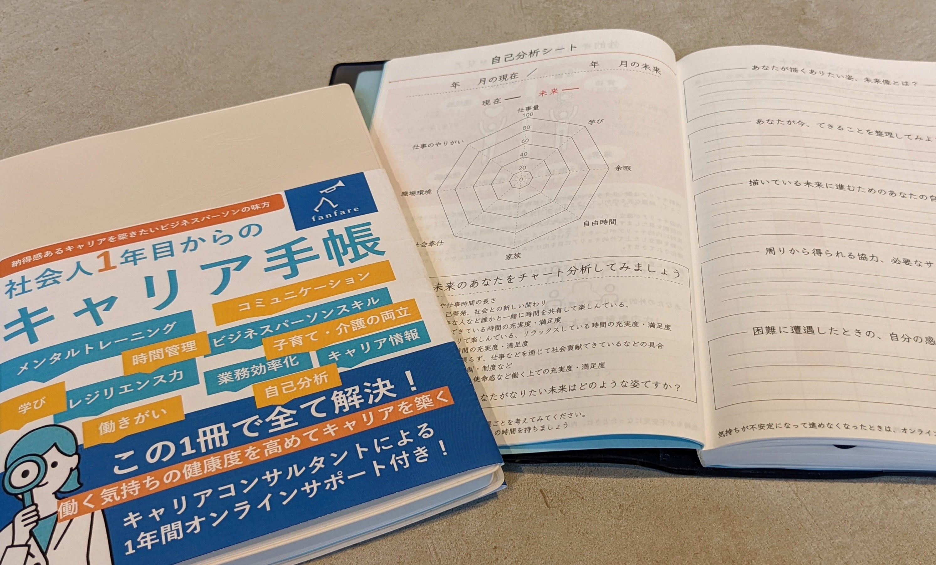 相談実績5,000件を超えるキャリアコンサルタントが手がけた自己分析ワークや情報が詰まった手帳。1年間オンライン相談付きで新社会人の豊かなキャリア形成を伴走します。