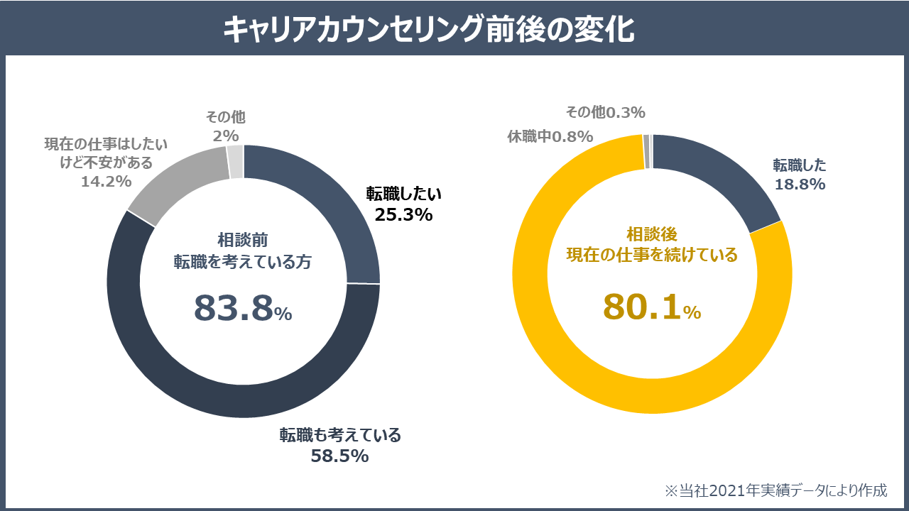 データにあるように、気持ちが整うことで現在の仕事に向き合うリテンション機能が働いている結果があらわれています。(2021年度弊社キャリア相談実績による)ただ、相談に来られる方は、ずっと一人で抱え込んできた真面目な方が多く存在します。「悩み続けた時間を少しでも短縮できたら、もっと誰もが豊かな気持ちでキャリアを築けるはず」その想いで、キァリアカウンセリングを身近に感じてもらいたく、手帳×オンライン相談のサービスを開始しました。