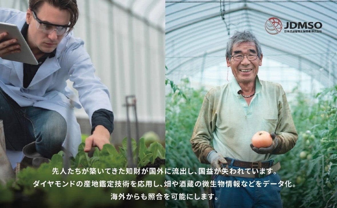 畑などの製造環境で、微生物や金属などの情報をデータ化し「ブランドの指紋情報」をつくります。生物のDNAだけではなく、育った環境情報もデータ化し照合できるので、盗まれた種や苗でDNAが同じでも「日本で生産されたものか?」という証明が可能になります。