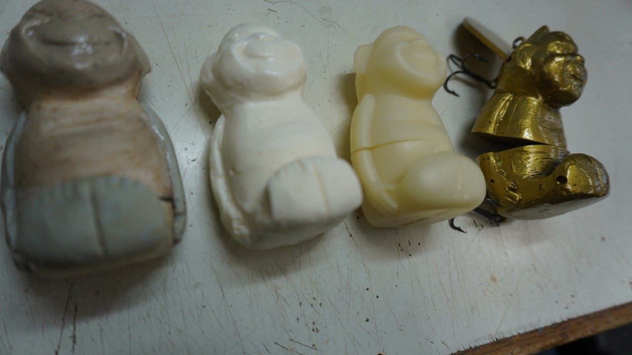 そんな“ビリケン”さんの商標権を持つ田村駒株式会社と大阪関西万博が開催される2025年に新しいプロジェクトを検討する中、deps代表であり数々の名作ルアーを生み出してきた奥村和正氏に「何か面白いことはできないか?」と持ちかけたことで奥村氏のインスピレーションが爆発。すぐさま木材を手削りしプロトルアーを作成し始めたところからビリケンルアーのプロジェクトがスタートしました。