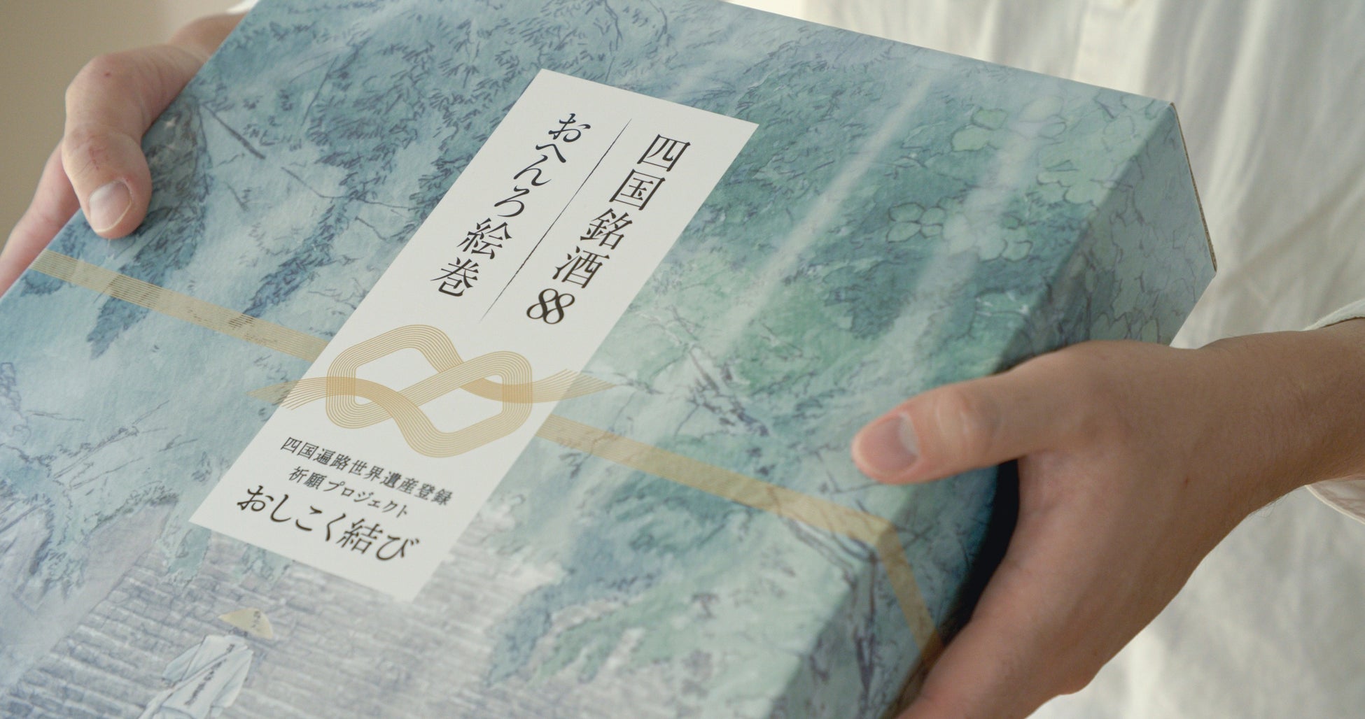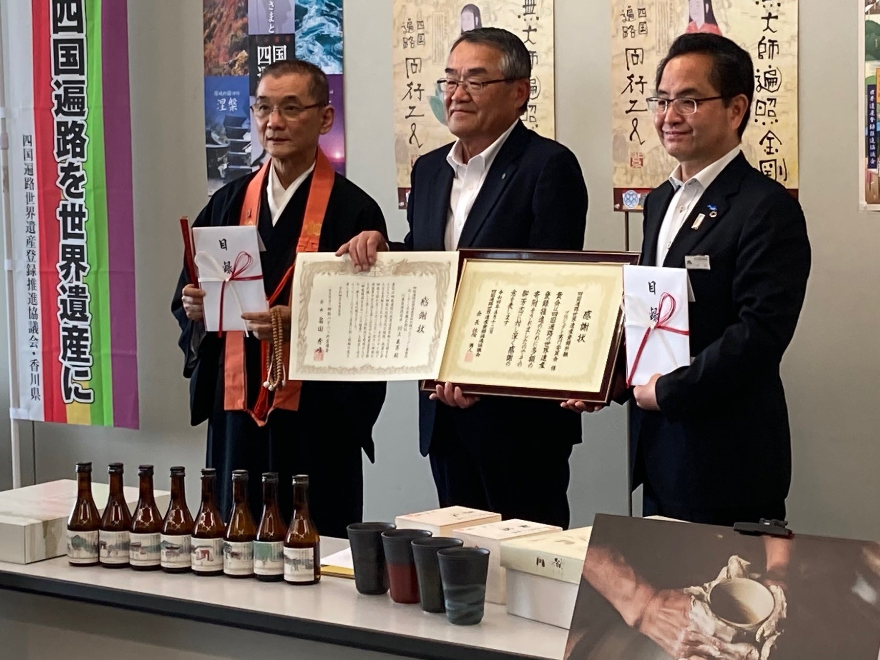 2021年に第一弾の活動として四国の酒蔵の日本酒セット「四国銘酒88 おへんろ絵巻」を全国に向けて販売。北は北海道、南は鹿児島県まで全国の方々にお届けしました。2022年には四国各県の札所の風景をイメージした砥部焼のカップ「おしこく器めぐり」を販売し、各売上の一部を四国八十八ヶ所霊場会と四国遍路世界遺産登録推進協議会の2団体に寄付しました。(写真左上:寄付金目録贈呈式)