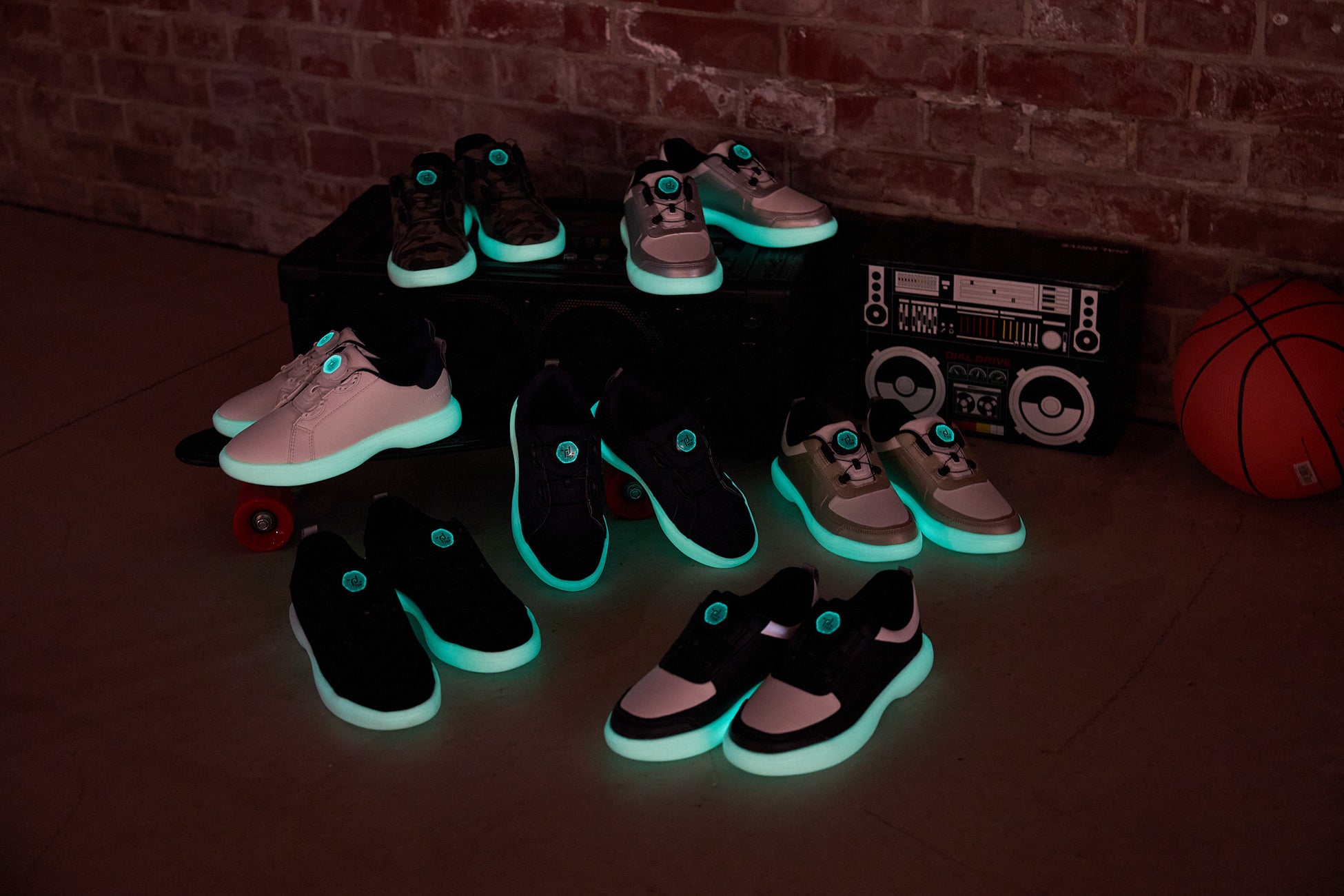 蓄光ソール搭載で暗闇で光る。
