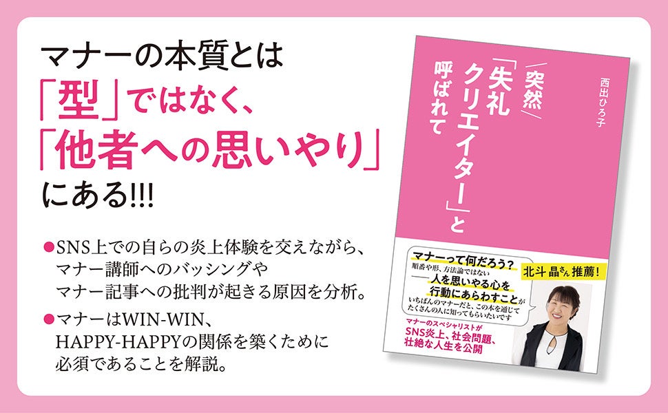 マナーは「型」ではなく「他者への思いやり」。「マナーでトラブルのない社会・平和」を提唱するマナーコンサルタント 西出ひろ子の最新刊『突然「失礼クリエイター」と呼ばれて』10月17日(火)発売。