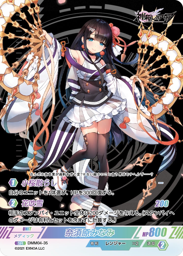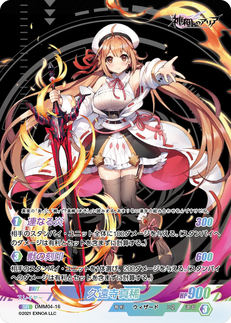 3DリアルタイムバトルRPG『神殺しのアリア』のキャラクターたちが登場する、DMM GAMESと株式会社TCGのタッグでお送りする新作トレーディングカードゲームです。本商品は12ヶ月連続でリリースされるDMM GAMESトレーディングカードコレクション(注1)の第4作目として発売を予定しており、同コレクション内12作品であれば異なる作品(注2)とも戦うことができる戦略性、コレクション性ともに満足いただけるトレーディングカードゲームとなっております。