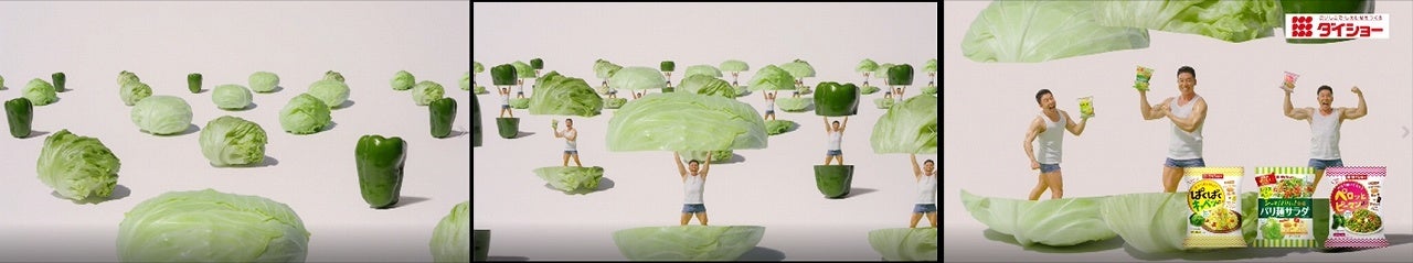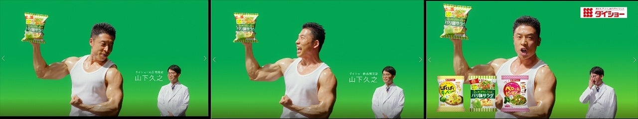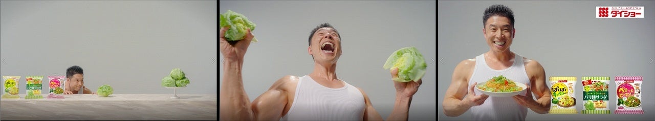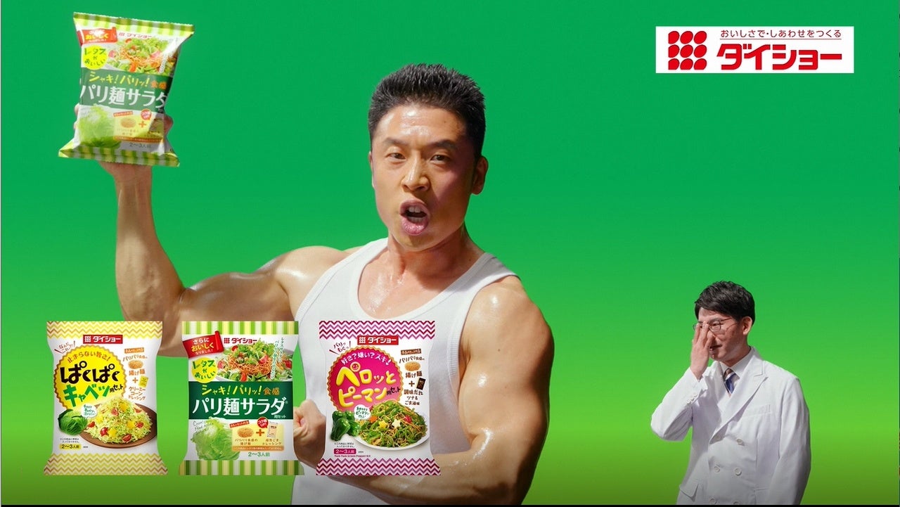 本CMは、2021年2月に公開した「焼肉一番」「焼肉通り」シリーズ、2021年9月に公開した「鍋スープ」シリーズのCMに出演していただいた、なかやまきんに君との第3弾となります。前々回、前回よりも「パワー!」アップしたCM内容となりつつ、初めてダイショー社員が登場したやり取りが必見となっています。『どっちなんだい!?』シリーズでは、初めてなかやまきんに君とダイショー社員が共演。なかやまきんに君お馴染みの「どっちなんだい!?」ギャグに対しダイショー社員が答える中、食い気味に「な〜〜るっ!」となかやまきんに君が叫ぶCM。また、『ダイショーパリ麺サラダ 野菜から、やーっ!』篇では、キャベツやレタス、ピーマンの中から「やーっ!」と叫びながら続々となかやまきんに君が登場します。