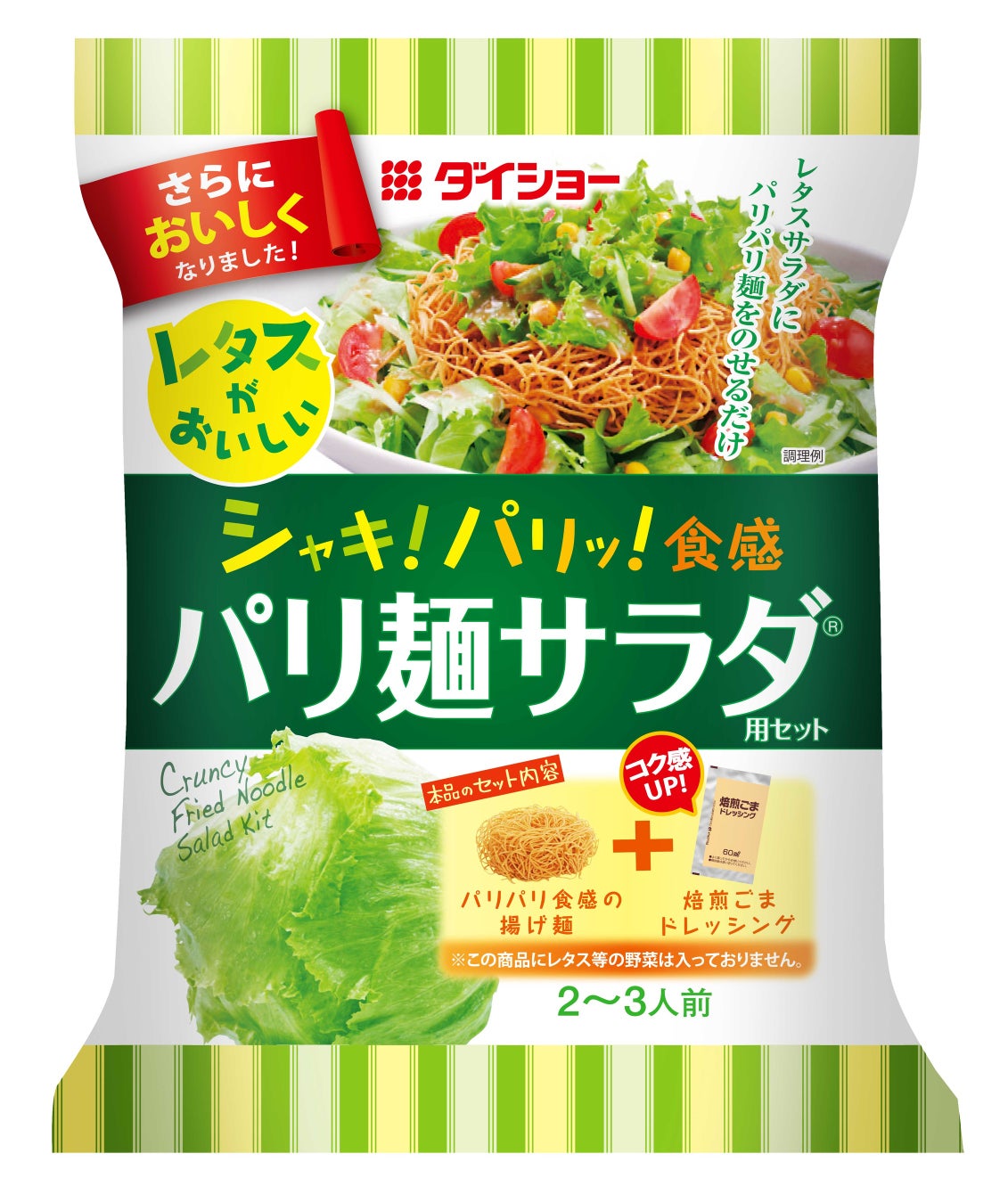 レタスのおいしさを引き立てる香ばしい揚げ麺と、ねりごまを(※)20%増量してコクとまろやかさがアップした焙煎ごまドレッシングをセットにしました。ボリュームのあるパリパリとした食感のサラダに仕上がります。