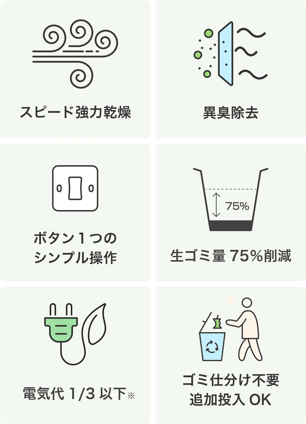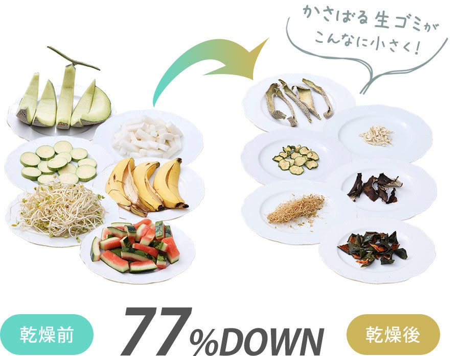 上から温風を吹きかけて乾燥させる従来のタイプと異なり、ムラなくしっかり乾燥させることで大幅に生ゴミの量を減らします。