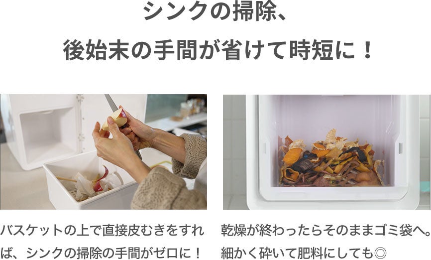 一方本製品は、最も手軽に使えてシンプルな機能が特徴の「乾燥式」を追求。独自システムによる強力な乾燥機能に加え、庫内のゴミの量を感知して温度調整する電力調整AIにより、「ワンタッチボタン」「いつでも追加投入可能」という直感的に使える操作性を実現しました。