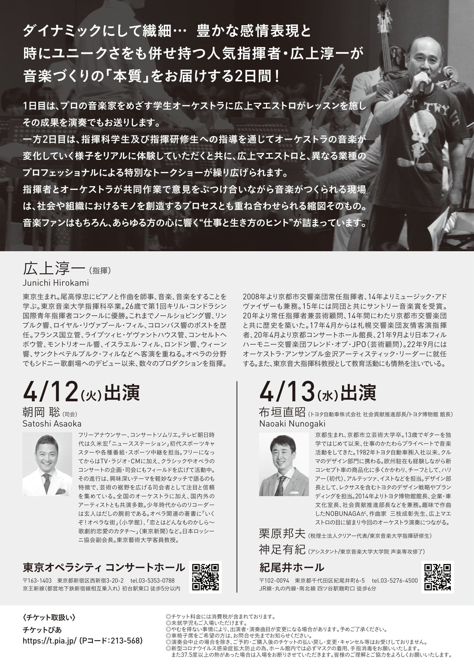 1日目は、プロの音楽家をめざす学生オーケストラに広上マエストロがレッスンを施しその成果を演奏でもお送りします。