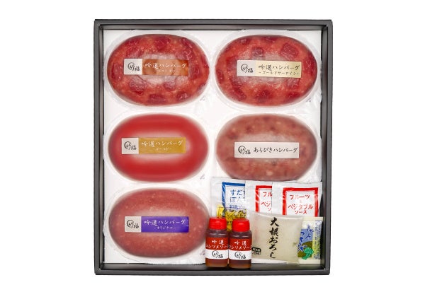 ハンバーグの食べ比べができるギフト商品として、あの新商品「吟選ハンバーグ・ゴールドサーロイン」が加わり5枚セットで登場!角切りA5サーロイン入り「ゴールドサーロイン」、角切り希少部位ヒレ入り「ベストオブ」、グレードの高い上ミンチを使用した「ゴールド」、黒毛和牛100%の「オリジナル」、食感が楽しい「あらびき」の5種類のセットになります。父の日ギフトカードもお付けできます。特別価格7,277円(税込)