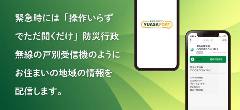 湯浅町に関わる防災情報や行政情報など多様な情報を地域住民に音声やテキストメッセージで届ける湯浅町公式の防災アプリです。スマートフォンやタブレット端末があれば、アプリをダウンロードするだけで無料でご利用いただけます。湯浅町以外にお住まいの方も利用可能です。また、従来型の携帯電話にも専用のケータイサイトで対応しています。