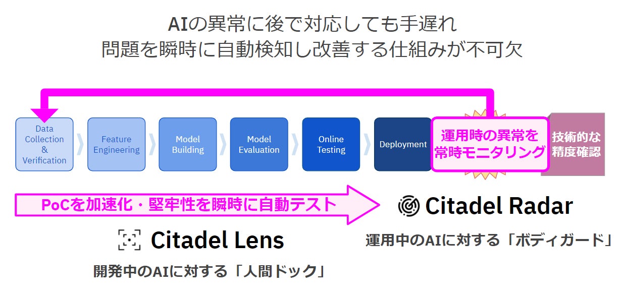 更に、昨年リリースした運用時の自動モニタリングを行う「Citadel Radar(シタデル・レーダー)」と併せてご利用頂くことで、開発からPoC・運用ステージに至るCI/CDパイプラインの中でエンドツーエンドで「信頼できる、説明可能なAI」の仕組みを構築することができます。