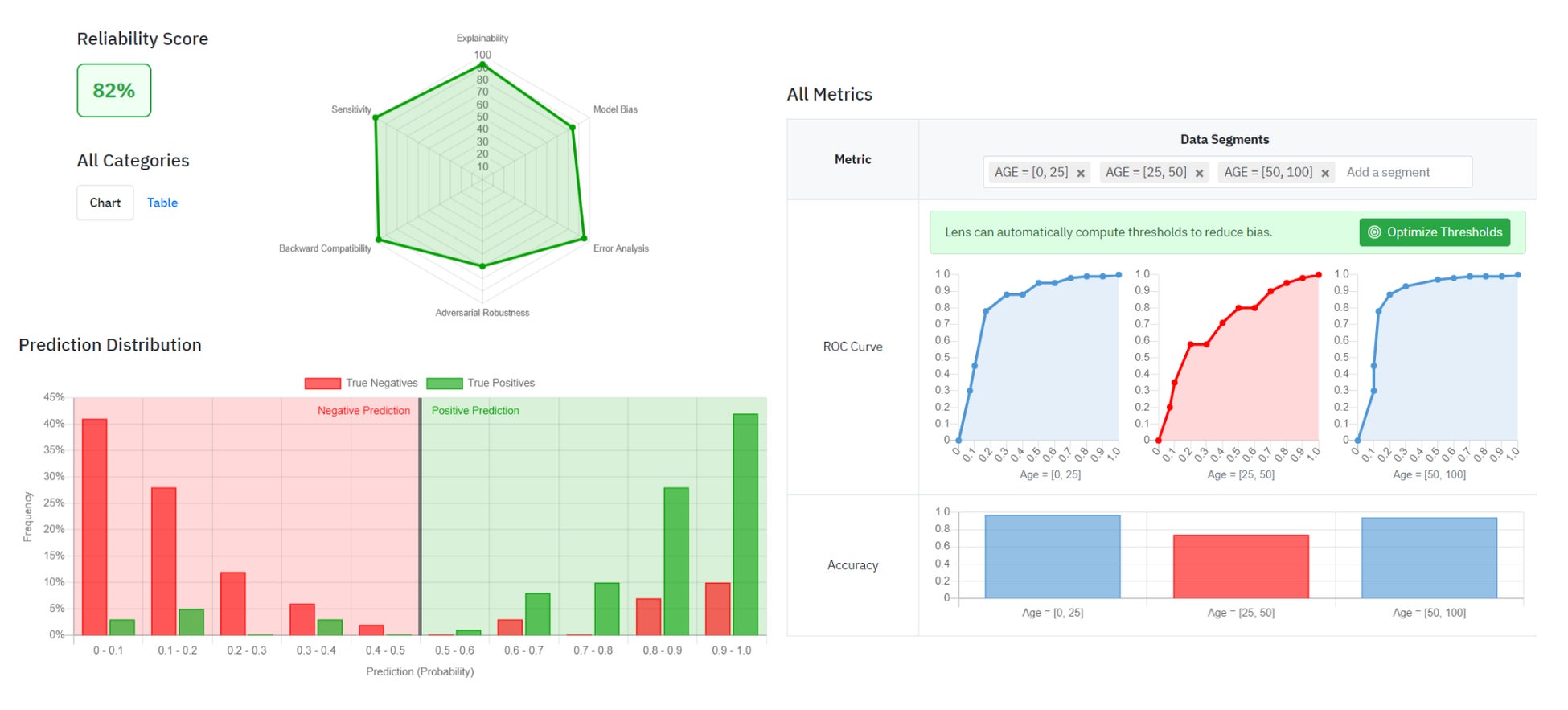 人手作業では検出が難しいバイアスや精度のばらつき、アタック耐性等を、顧客セグメントやデータ毎に深堀りして精査し、AIの弱点や異常を瞬時に炙り出し「点数化」します。