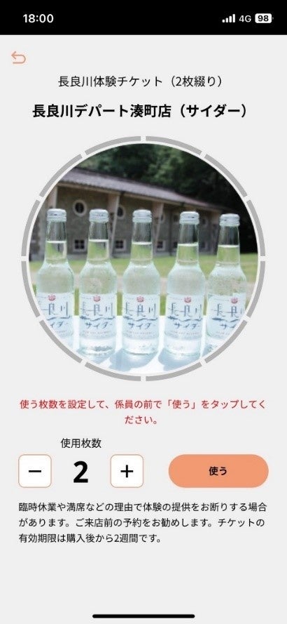 チケットを使う施設に設置されたQRコードを読み取り、使用枚数を選択した上で、係員に提示します。