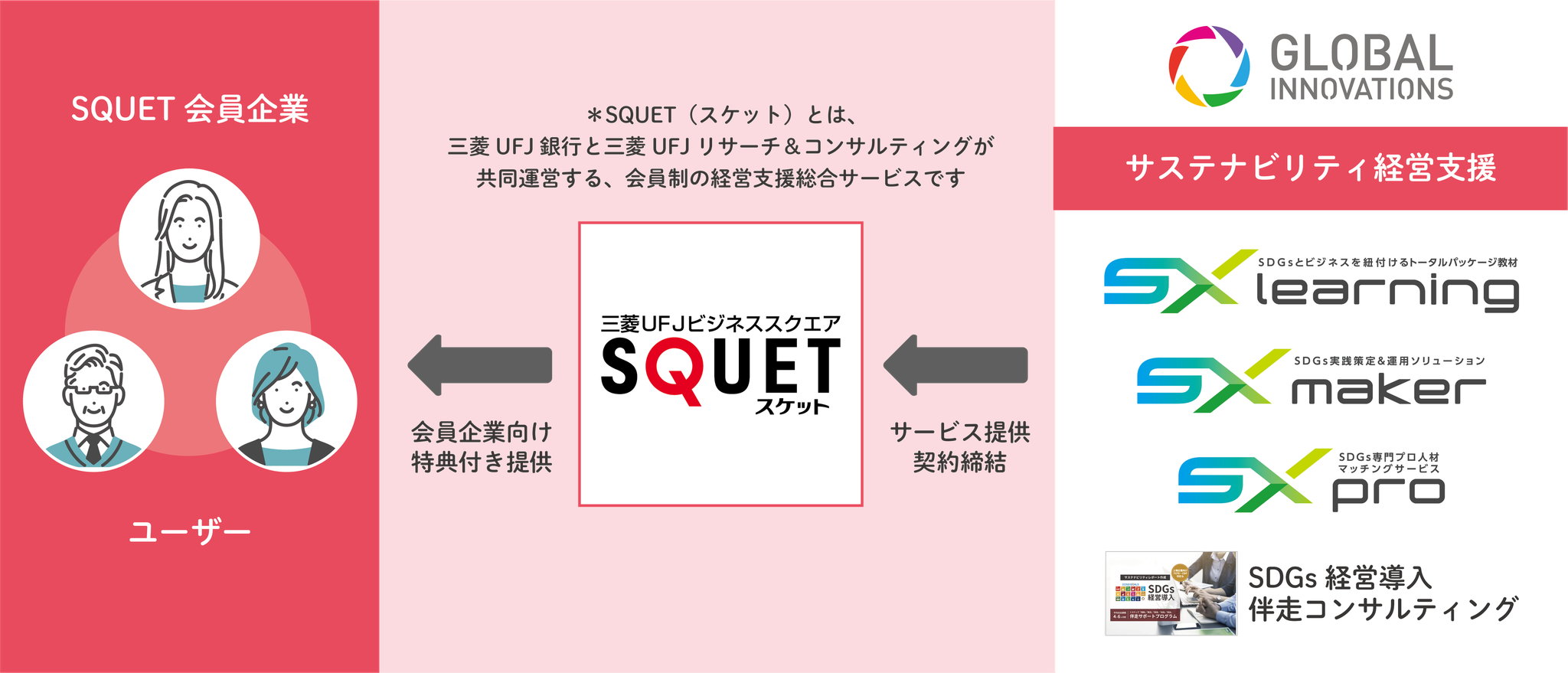 日本唯一のSDGs専門ビジネススクールを運営及び企業別SDGs経営支援サービスの提供を行う株式会社グローバルイノベーションズ(所在地 東京都港区、代表取締役 黒岩 賢太郎)は、三菱UFJフィナンシャル・グループの総合シンクタンクである三菱UFJリサーチ&コンサルティング株式会社(所在地 東京都港区、代表取締役 池田 雅一)が運営する会員制の経営支援総合サービス「SQUET(スケット)」にて、サステナビリティ経営支援に関するサービスを提供する契約を2022年2月10日付で締結しました。