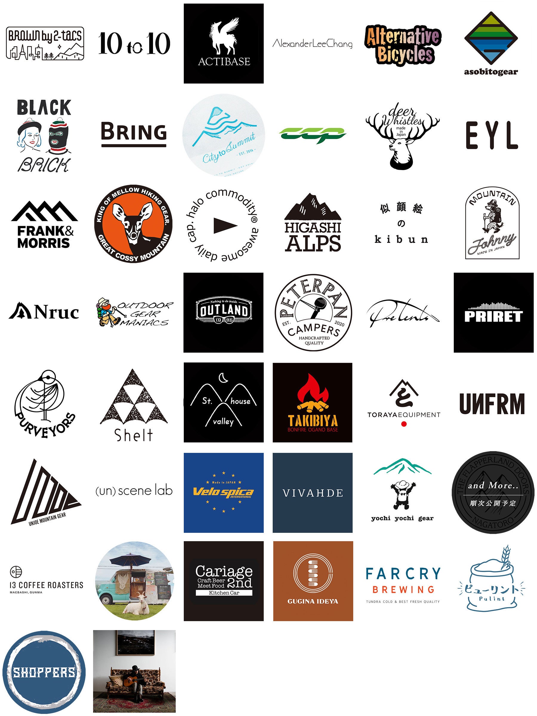 「2-tacs」「10to10」「ACTIBASE」「AlexanderLeeChang/2[Ni]」「Alternative Bicycles」「asobitogear」「BLACK BRICK」「BRING」「City to Summit」「CCP」「deer whistles」「EYL」「FRANK&MORRIS」「Great Cossy Mountain」「halo commodity」「HIGASHI ALPS」「似顔絵のkibun」「Nruc」「MOUNTAIN JOHNNY」「OUTDOOR GEAR MANIACS」「OUTLAND1995」「PETERPAN CAMPERS」「Pre Tents」「PRIRET | プライレット」「Purveyors」「Shelt」「st.valley house」「TAKIBIYA」「TORAYA EQUIPMENT」「UNFRM OUTDOOR STANDARD」「UNJOE GEAR」「(un)scene lab」「velo spica」「VIVAHDE」「yochi yochi gear」