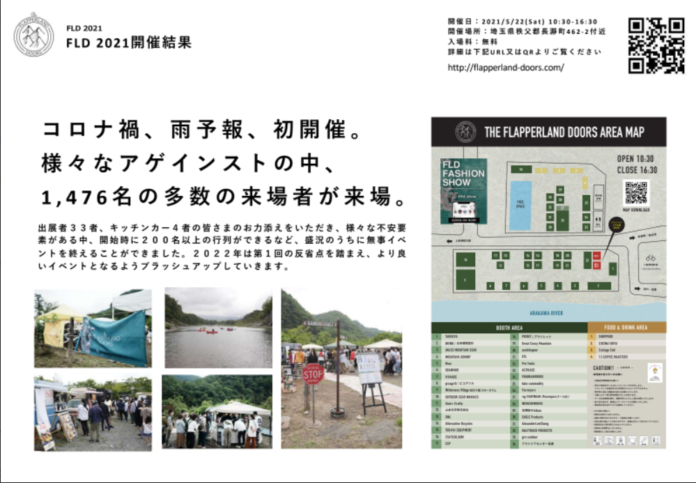 「THE FLAPPERLAND DOORS」(フラッパーランド ドアーズ)は、アウトドアギア展示会を軸に、長瀞町の既存コンテンツである「アウトドア」や「観光」、「自然」を参加者に楽しんでもらう、町全体を活用したイベントです。本イベントは都心から日帰り可能なアクセス、かつアウトドアコンテンツや自然が豊富な長瀞町の既存資源を活かした新しい形のイベントで、昨年が初の開催となり1,476人もの方にご来場いただき、今回は第2回目の開催が決定いたしました。