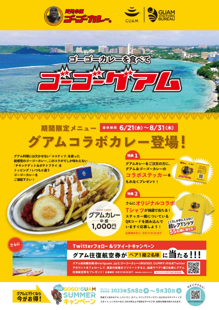 本企画は、グアム政府観光局が先月から開始している「GoGo! GUAM SUMMER キャンペーン」の一環で、グアムカレーの注文でコラボステッカーのプレゼントやオリジナルコラボTシャツの抽選、さらにグアム往復航空券が当たるツイッターキャンペーンを実施します。ゴーゴーカレーを食べてグアムの魅力を楽しんでいただくための取り組みで、 グアム政府観光局のキャンペーン名「GoGo GUAM」と社名の「GoGo CURRY」の語呂合わせでコラボが実現しました。
