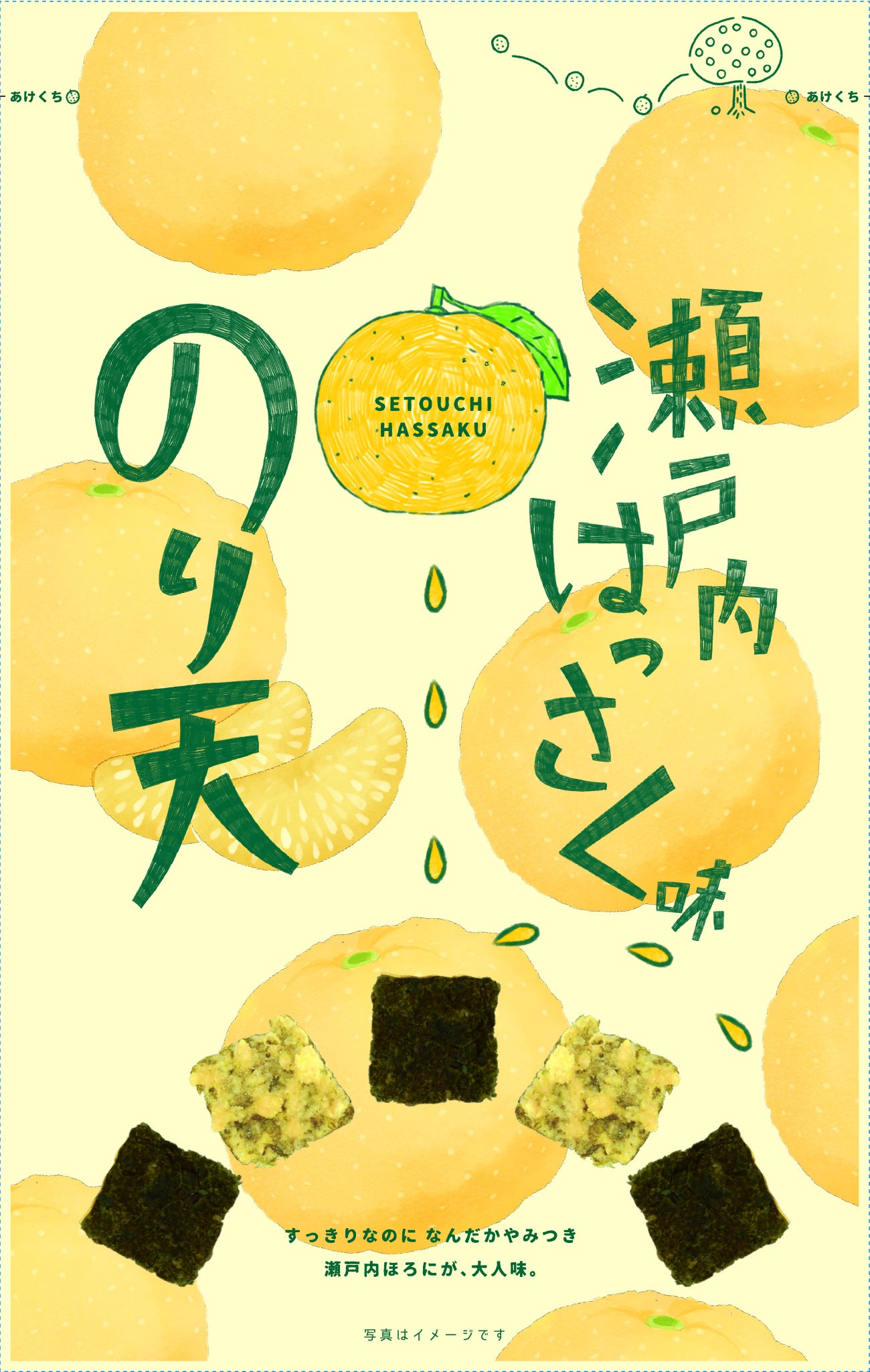 「はっさく」は、広島県でレモンの次に育てていきたい柑橘と捉えており、はっさく特有の苦味と果肉のみずみずしさを、「のり天瀬戸内はっさく味」で表現しました。