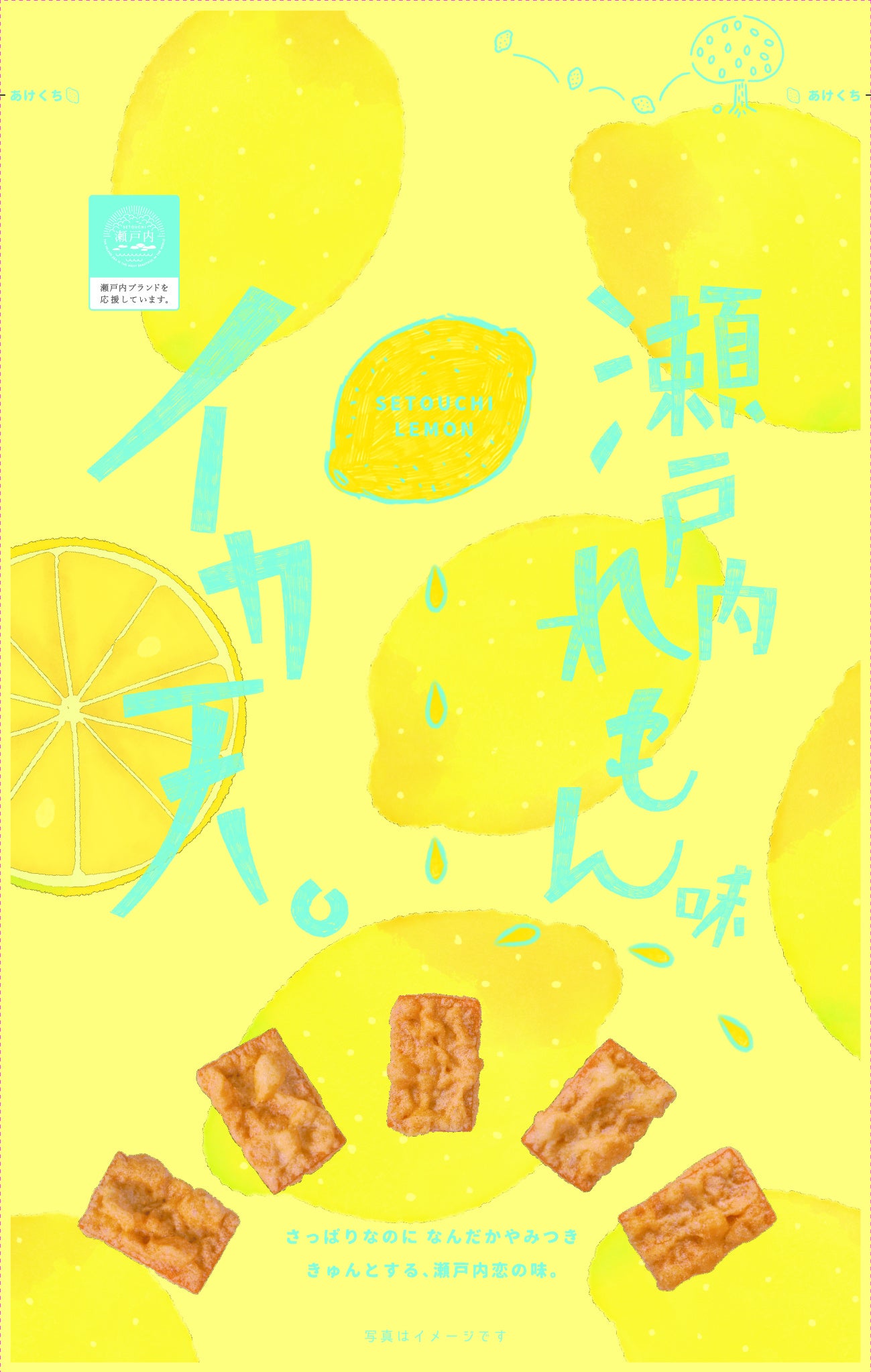 お店でこの商品を見かけた際に、「あっ!イカ天瀬戸内れもん味」と気づいてもらえるパッケージでありながらも、れもん感をより一層感じられるように黄色の色調を濃くしました。また、女性が食べやすい一口サイズであることを伝えるために、イカ天を1つ1つ並べました。