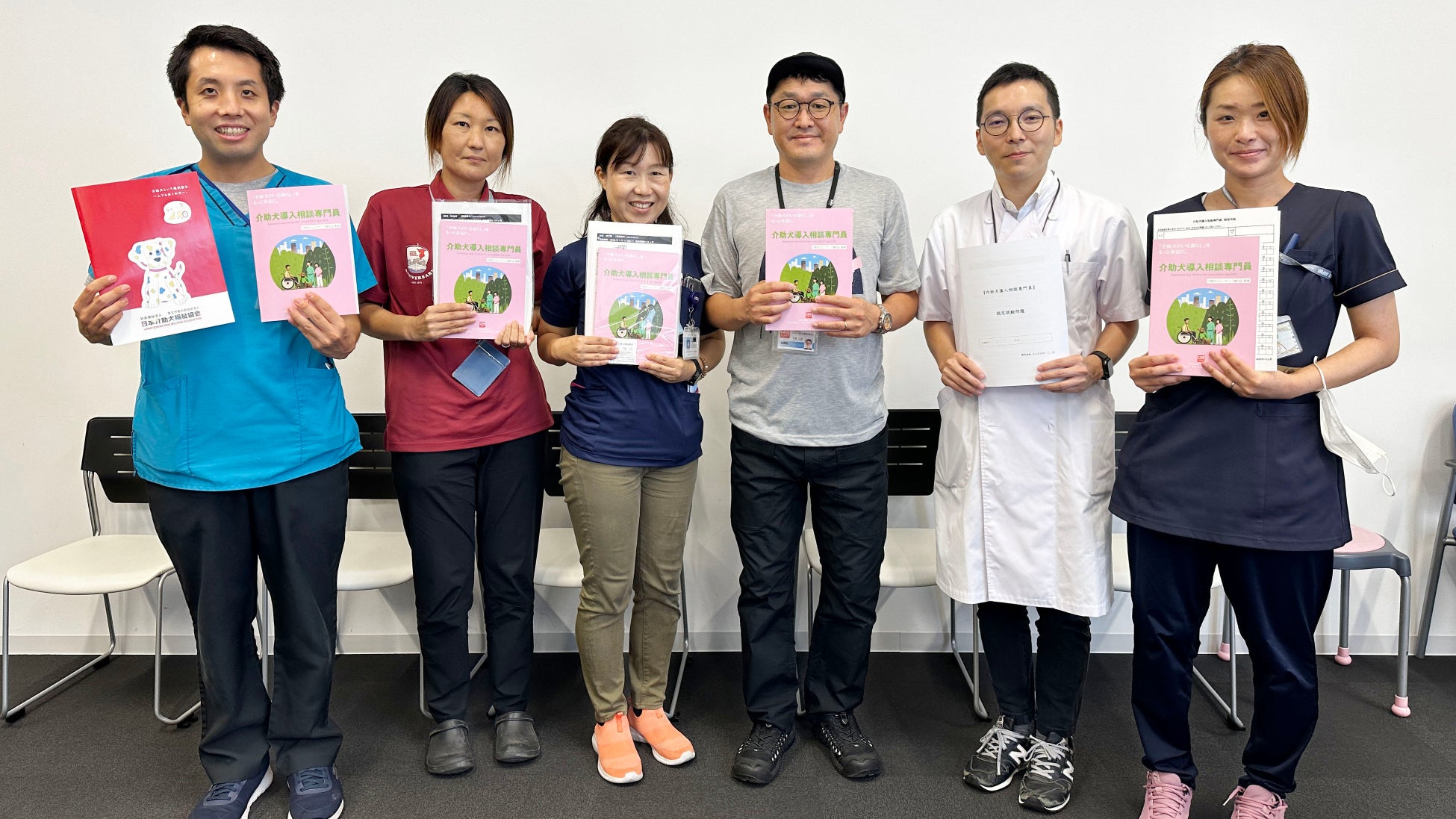 鴨川市立国保病院がこの資格の導入に動いたきっかけは、2024年1月に開催された「安房医療ねっと(注1)」という有志の集まりの勉強会です。この勉強会に当協会の介助犬訓練士の川崎(常務理事)が講師として招かれ、その時の介助犬に関する学びが今回の試みへとつながりました。現在、所属する作業療法士、理学療法士、介護福祉士、介護支援専門員などの6名が資格取得に向けて進んでおり、同時に介助犬適合者の探索も進められています。