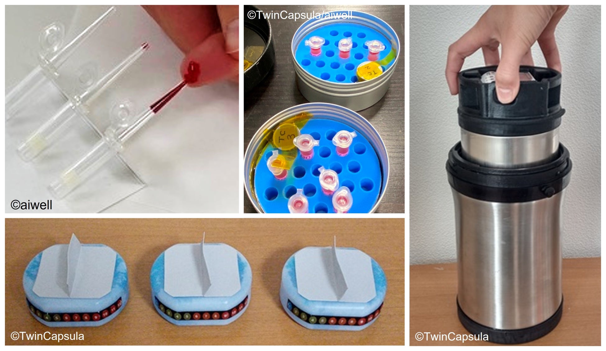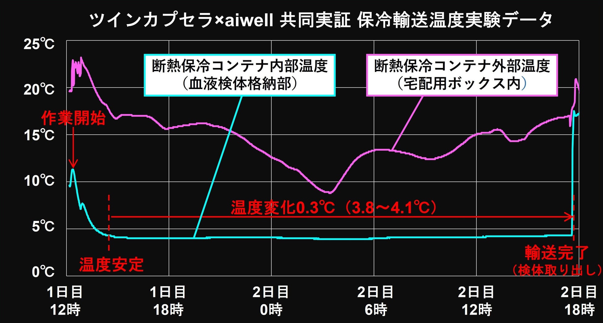 JAXAベンチャーの株式会社ツインカプセラ(本社:茨城県つくば市、代表取締役 宮崎和宏、以下「ツインカプセラ」)と国立大学法人東京工業大学発ベンチャー認定企業aiwell 株式会社(本社:東京都千代田区、代表取締役 馬渕浩幸、以下「aiwell」は、ツインカプセラが開発中の小型・超高性能断熱保冷容器を用いて、aiwell社の微量採血キット『aiwell CARE』にて採取した血液検体を、常温宅配便により高精度の保冷輸送を行う初の実証実験に成功しました。
