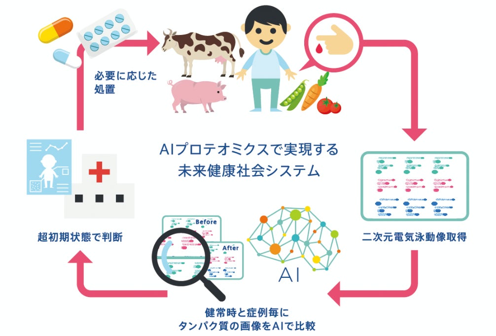 国立大学法人 東京工業大学 生命理工学院 准教授 博士(理学) 林 宣宏氏が発明した、生体の状態をタンパク質の解析に基づいてプロファイルする次世代特許技術。二次元電気泳動技術のハイスループット化と高感度化に成功。タンパク質の二次元電気泳動画像をAIが学習することにより、様々な病気や怪我になる予兆を発見する身体情報提供サービスとして社会実装を目指しています。敗血症においては、98.2%の精度で的確な判断を可能にしました。(関連動画: https://www.youtube.com/watch?v=uGXMXDuDV38&t=3s)