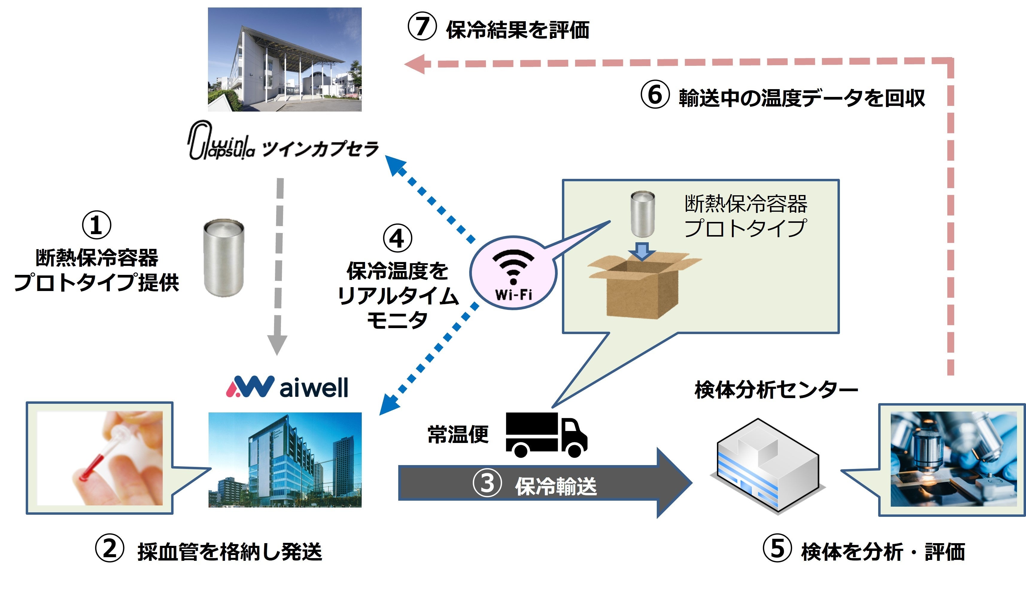 このニーズに対し、ツインカプセラが保有する超高性能な断熱保冷容器に関する技術シーズの活用が有効との共通認識の下、昨年(2021年)12月、ツインカプセラとaiwellは、共同実証実験に関する業務提携契約を締結しました。今回の実証実験はこの契約に基づき実施したものです。(https://prtimes.jp/main/html/rd/p/000000004.000076369.html)