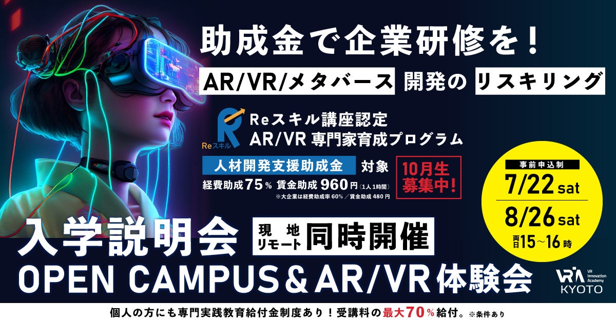 VRIA京都では、DX人材不足やリスキリング、次世代育成への貢献という、設立当初からのビジョンのもとAR/VR分野の人財育成に尽力してまいりましたが、国や地方自治体、民間企業が一体となり、「誰もが活躍できる社会を目指し、あらゆる人のスキルをアップデートするリスキリングに取り組む」という、日本リスキリングコンソーシアムの目的、試みに賛同し、リスキリングパートナーとして参画いたしました。