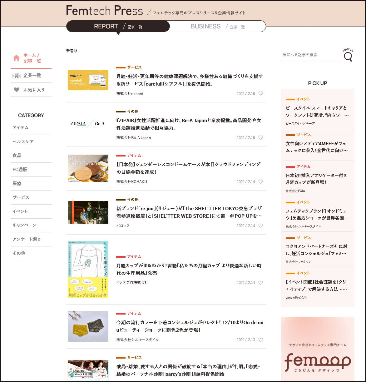 フェムテックに関連する記事をはじめ、関連企業の情報も閲覧・検索することができます。