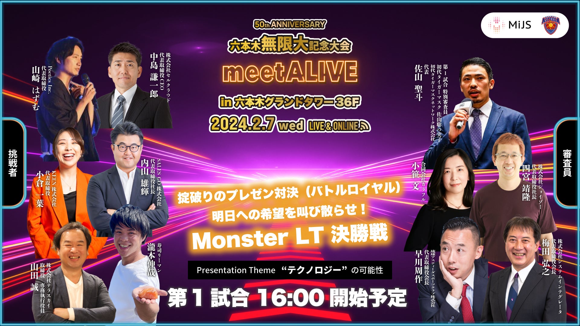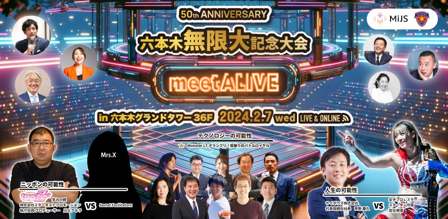 日本の有力ソフトウエアベンダーが集結する業界団体Made In Japan Software & Serviceコンソーシアム(略称:MIJS、理事長:羽田 雅一(ビジネスエンジニアリング株式会社 取締役社長))は、琉球アスティーダスポーツクラブ株式会社(所在地:沖縄県中頭郡中城村、代表取締役会長兼社長:早川周作)と共催し、meetALIVE 開催50回記念 特別企画 「六本木無限大記念大会」を開催いたします。