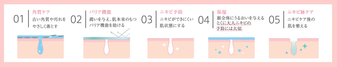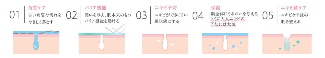 ニキビの予防から、ニキビケア後のくすみまでもケア。繰り返すニキビのループにさよならしましょう。顔全体の保湿にも、ポイント集中ケアにも。肌にやさしく、みずみずしいジェルです。