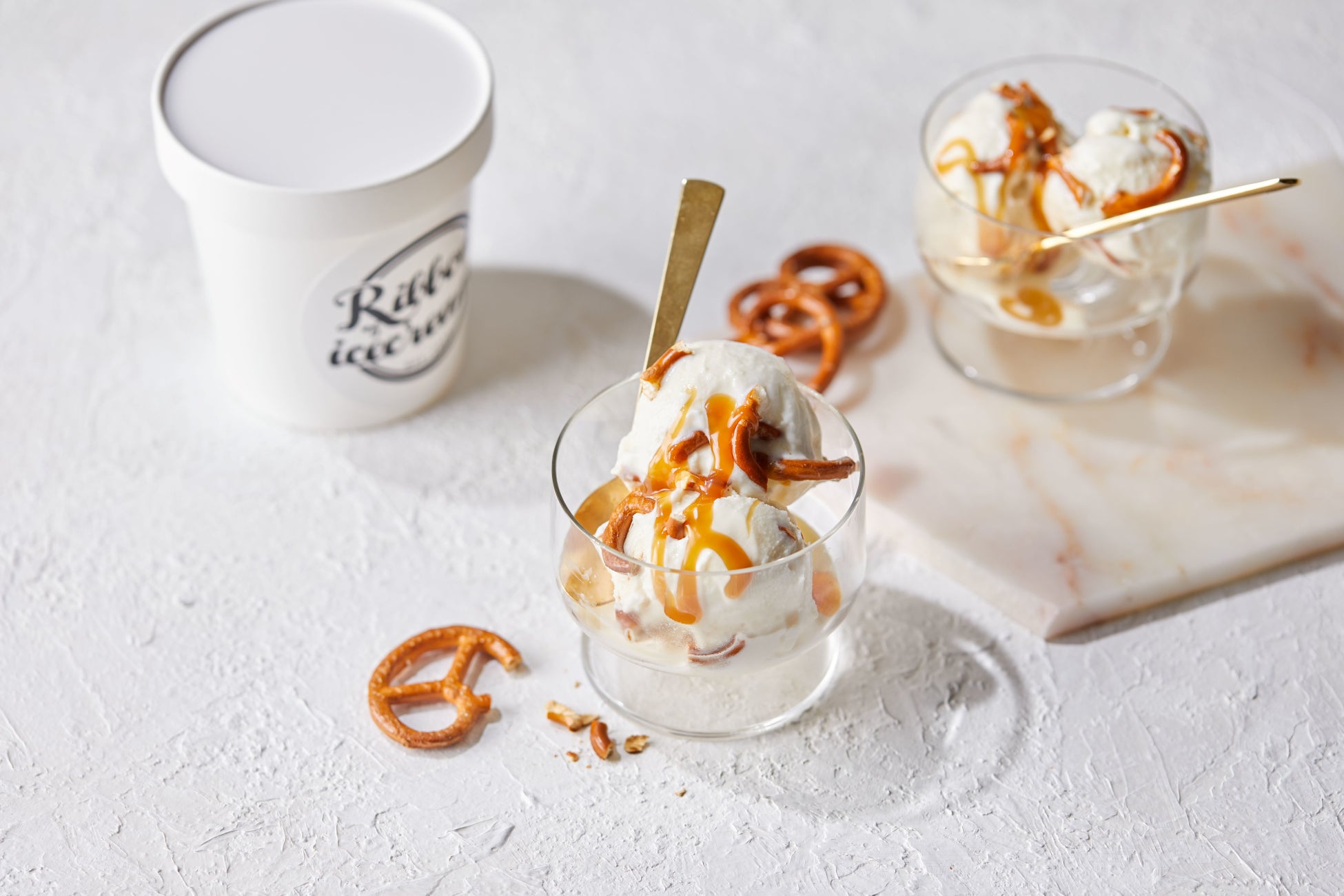 塩キャラメルプレッツェル:ミルクアイスと塩キャラメルクリームをマーブル状にミックスし、オーガニックのプリッツェルを混ぜ込んだリボンアイスを代表するフレーバー。グラスフェッドバターやオーガニックのさとうきび、ヒマラヤ岩塩など良質な材料をふんだんに使用。