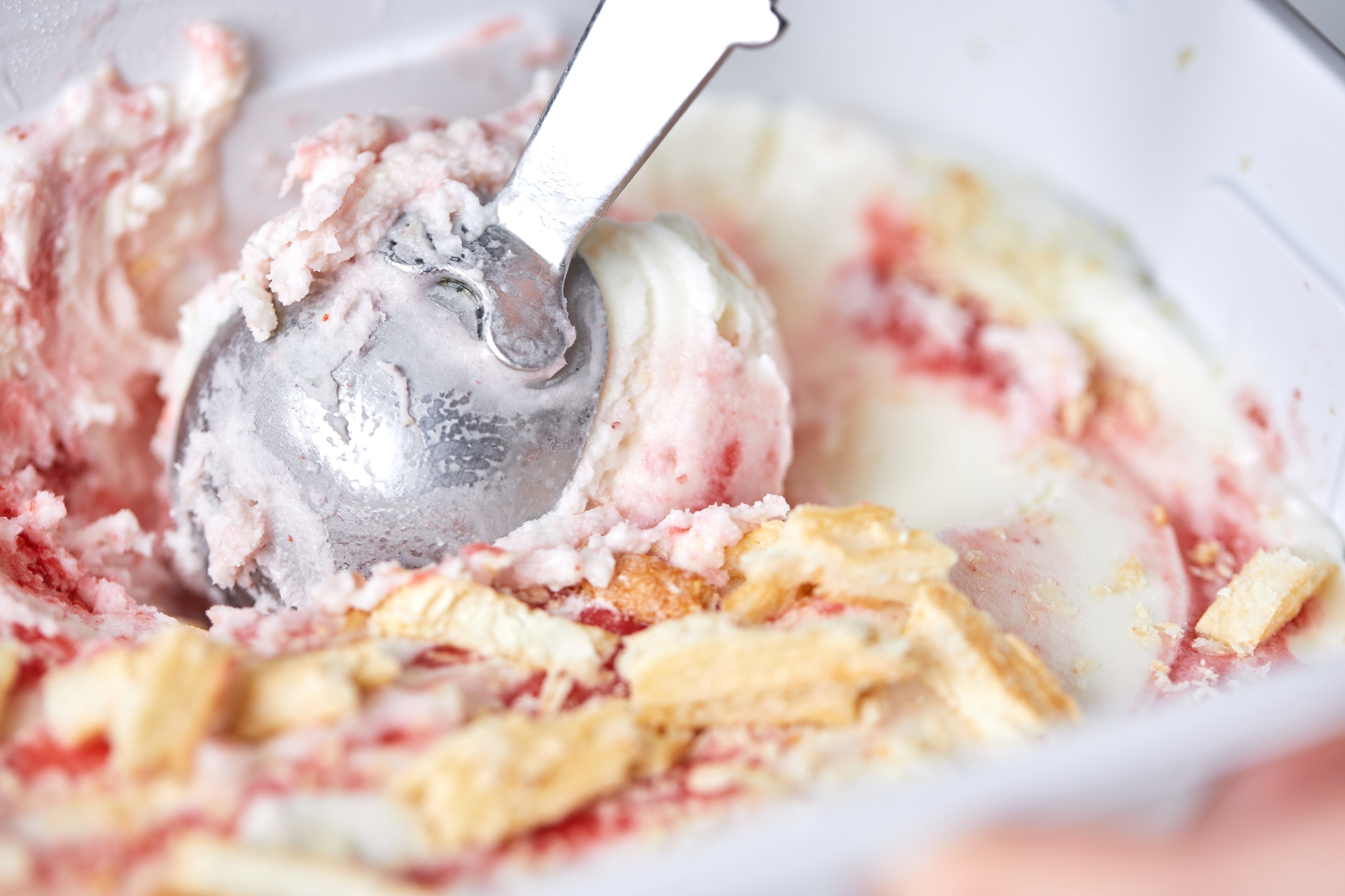 イチゴミルフィーユ:ミルクアイスに、オーガニックのイチゴを使用した自家製イチゴソースとパイ生地を練りこんだ、スイーツ仕立てのフレーバー。