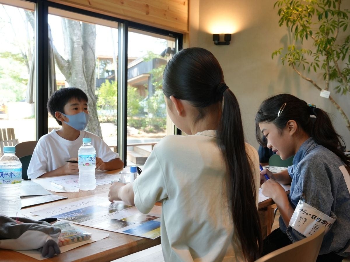 ワ―ケーションエリアとして人気の北杜市。夏休み中であった子供達の自由研究を応援できればと、施設のリビングスペースで子供たちが記者に扮し、上村英司北杜市長に地元の魅力をインタビュー。それを新聞形式にまとめるワ―ケーション体験を行いました。